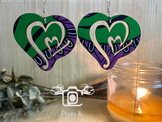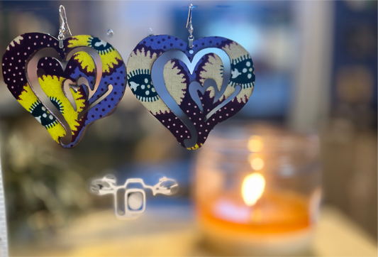 COLOR-SIS01 Large Size Lightweight Wooden Heart Design Earrings Hypoallergenic Statement Piece (Approximately 80mm) African Print