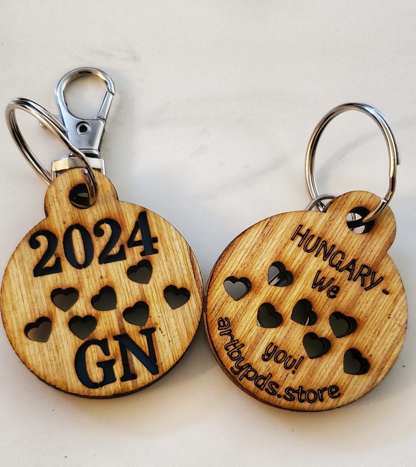 More than just a keychain, it’s a message from your heart. Like carrying a greeting card with you all the time. Wood engraved, double sided keychain. Cut-outs and colorization to enhance your personalized design. Includes assembly and keychain with clip.